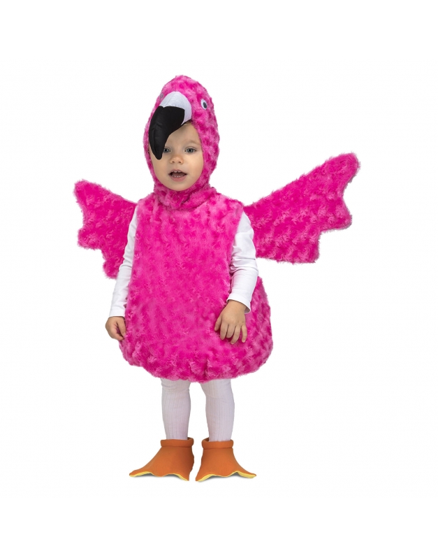 Disfraz de flamenco que incluye mono con alas, capucha y pies.