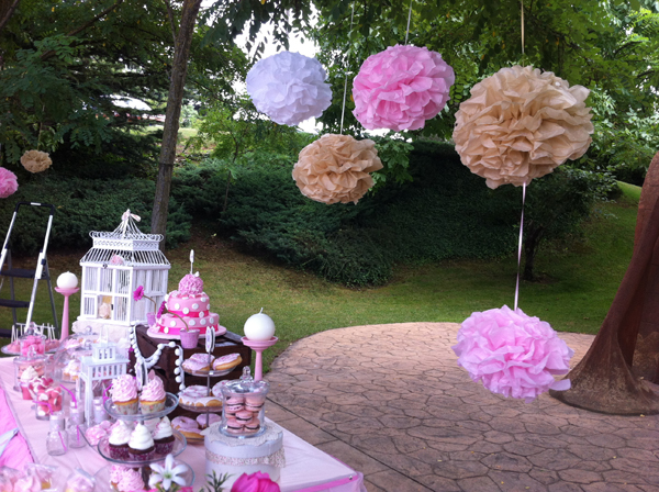 Per a la decoració exterior vem utilitzar pompons de color rosa pastel, crema i blanc que van donar un toc molt dolç a l’espai.