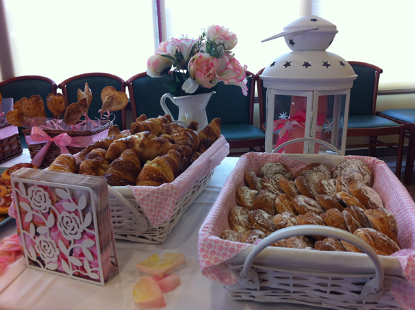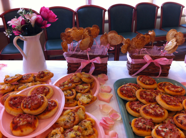 Taula salada amb pizzes, cors de pernil i formatge, croisants, ensiamades…